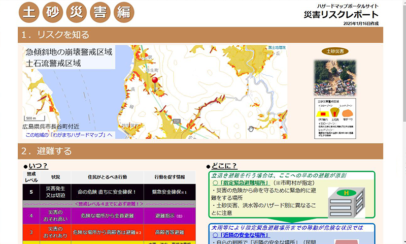 各項目の右のアイコンを押すとその項目の「災害リポート」が表示されます。